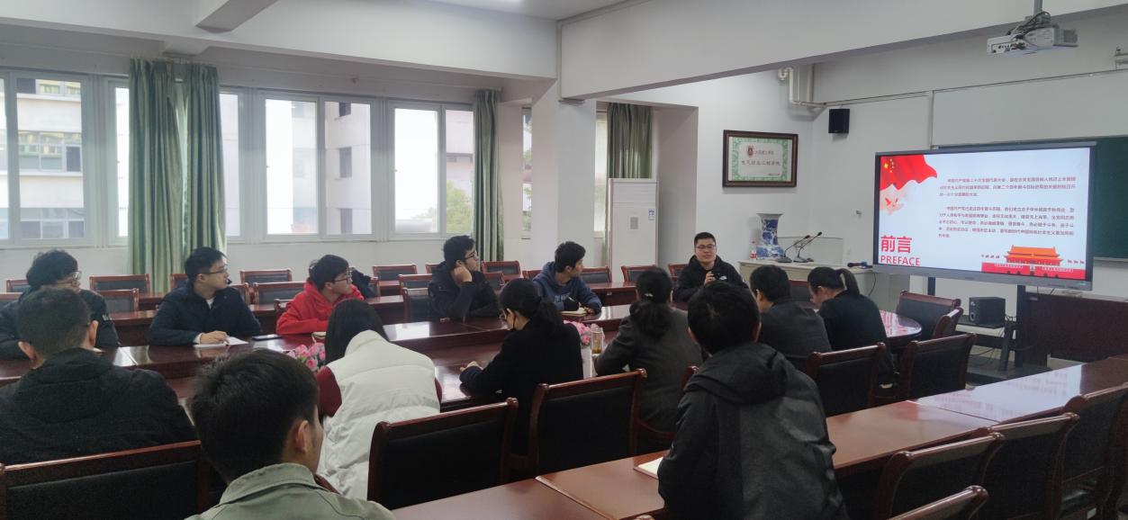 2022年11月24日下午,在电气信息工程学院309会议室,电气工程系教工党支部与电气工程系学生党支部联合开展学习党的二十大精神主题党日活动,邀请我校党史宣讲团成员、马克思主义学院青年博士、中国近现代史纲要教工党支部周杨博士宣讲党的二十大精神,会议由电气工程系教工党支部副书记林雪主持,电气工程系全体师生党员参加本次活动。