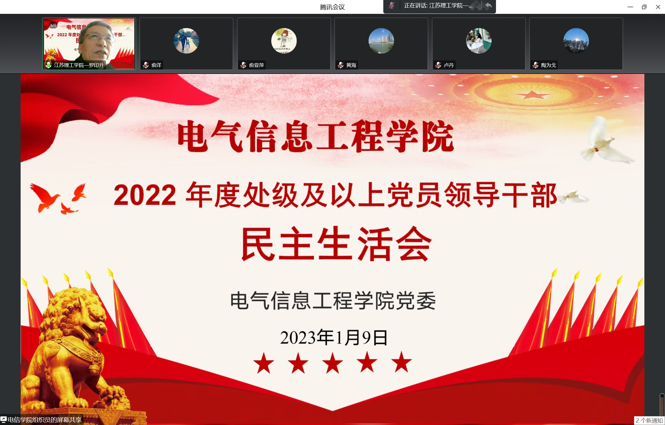 根据学校党委统一安排部署和《江苏理工学院 2022 年度处级及以上党员领导干部民主生活会实施方案》具体要求,我院党委于2023年1月9日下午,通过腾讯会议召开了2022 年度专题民主生活会。校党委常委、副校长、统战部部长俞亚萍列席会议并讲话,会议由学院党委书记罗印升主持。