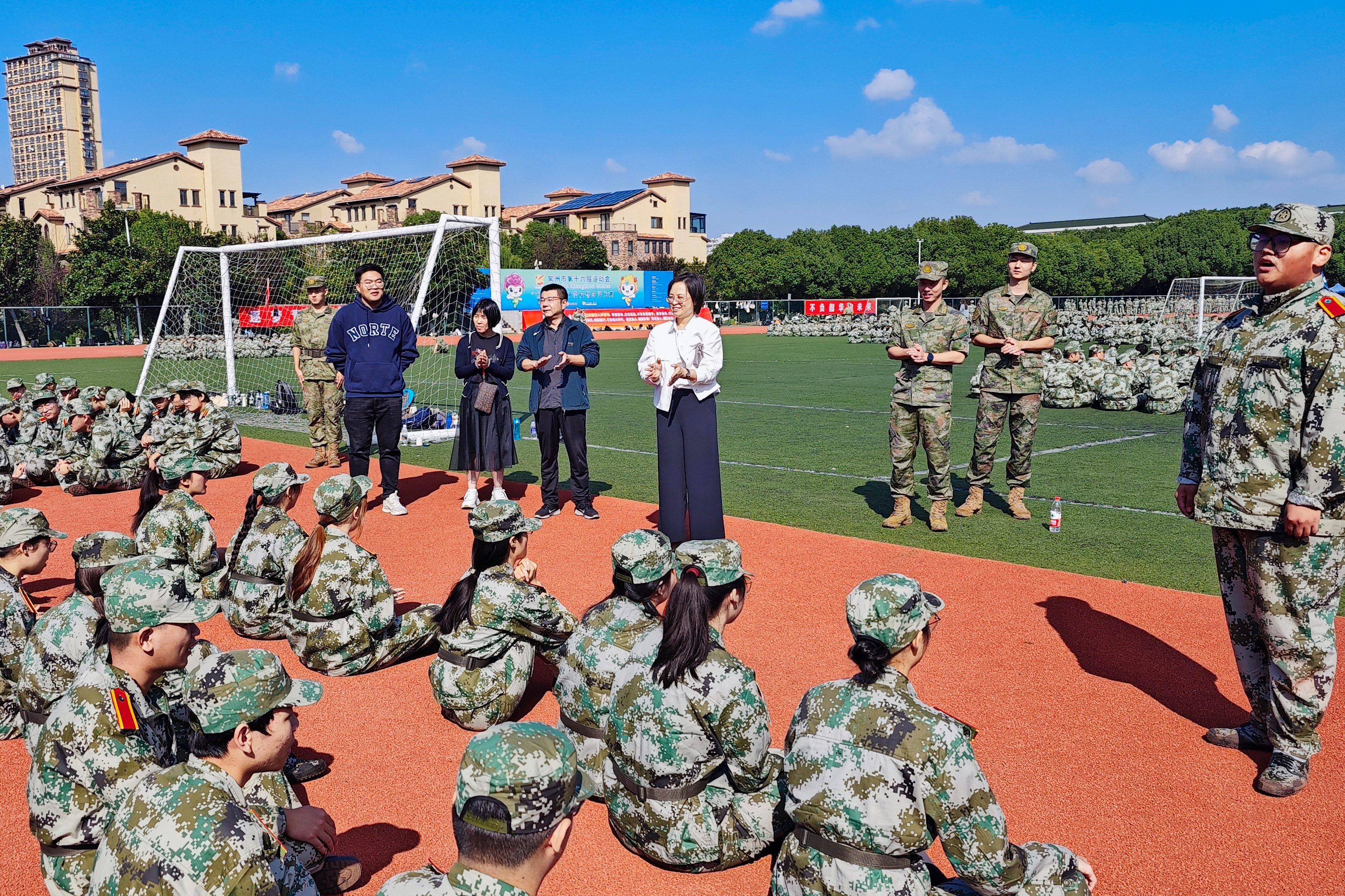 俞亚萍与正在进行军训的新生们进行了交流,鼓励同学们要保持积极向上的心态,充分利用军训的机会锻炼自己的身心,增强家国情怀,也要注意做到科学合理作息。同时,她还对承训教官表示了感谢,感谢他们为新生军训付出的辛勤努力。