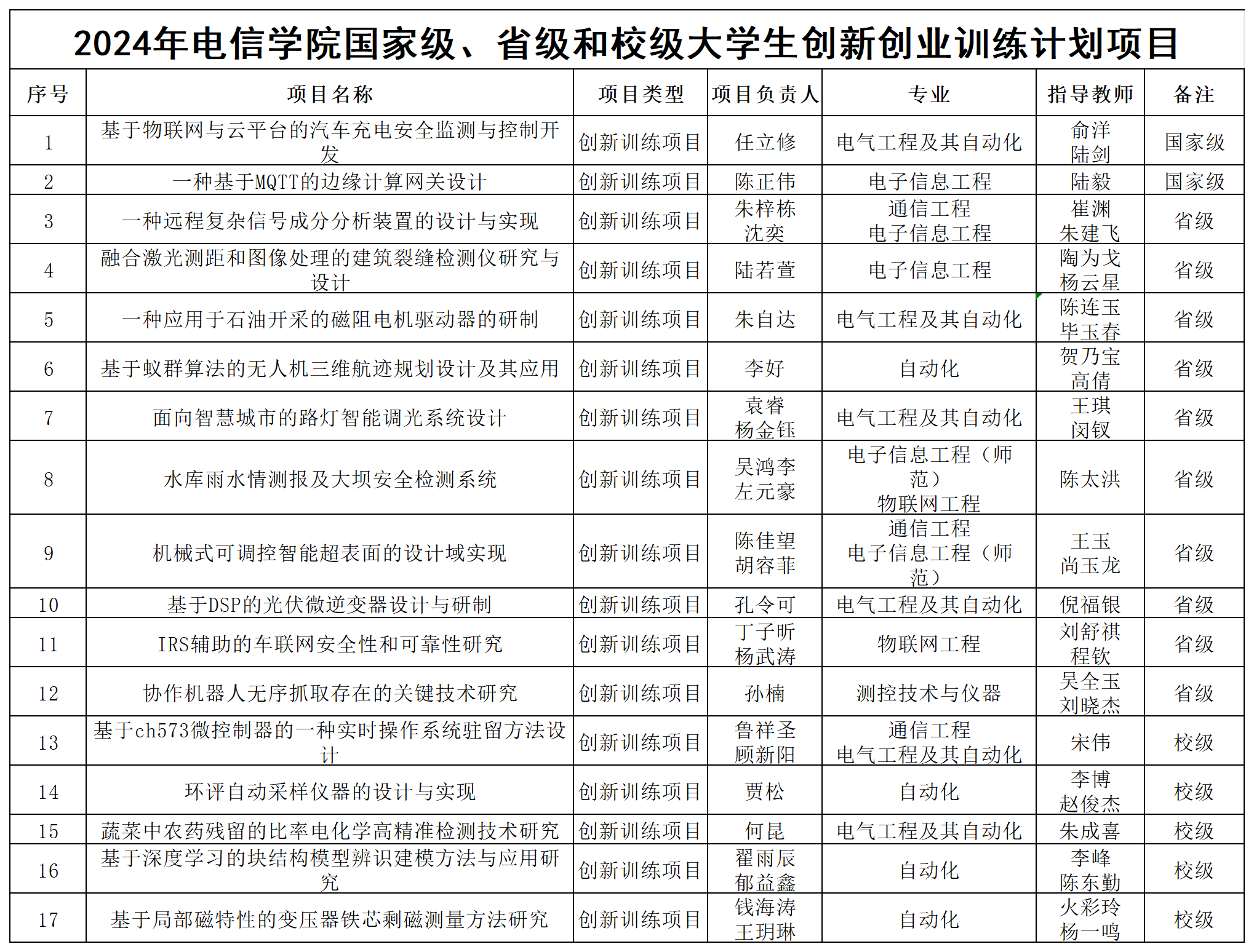 2024年电信学院大学生创新创业训练计划立项项目