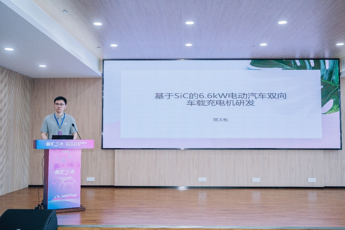王鑫以《新能源汽车永磁同步电机高性能驱动系统设计》为题,系统阐述了电机控制算法优化及高功率密度设计等核心内容,并结合姜堰区新能源零部件产业集群优势,提出了“产、学、研、用”一体化落地路径。陈天牧聚焦《基于SiC的6.6kW电动汽车双向车载充电机研发》,从宽禁带半导体应用、智能充放电策略商业化场景切入,论证了技术方案与区域充电基础设施建设的协同可行性。