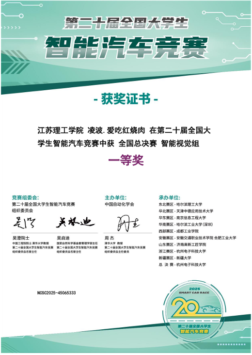 近日,第二十届全国大学生智能车竞赛总决赛在杭州电子科技大学举行。我院智能车俱乐部宋伟等老师指导的20余名同学参加了该项赛事,获全国一等奖1项、二等奖1项。其中,李信燃、孙康、倪诗炆等同学组成的“凌波.爱吃红烧肉”队获得全国总决赛智能视觉组一等奖,张华秋、赵博伦、刘思豪、贾宇航等同学组成的“凌波·夜幕”队获得全国总决赛完全模型组二等奖。此前,我院8支队伍分别获得华东赛区一等奖3项、二等奖4项、三等奖1项。