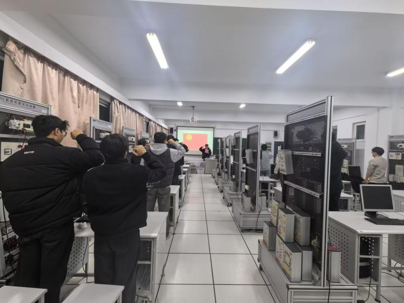 随后,活动进入仪式教育环节。全体成员面向国旗肃立,奏唱国歌,激昂的旋律回荡在教室中,进一步凝聚了团员青年的初心使命与责任担当。紧接着,在信捷自动化科技俱乐部社长朱栋的领誓下,团员代表面向团旗庄严宣誓,铿锵有力的誓言彰显了青年一代传承红色基因、投身科技报国的坚定决心,也让在场师生接受了一次深刻的思想淬炼与精神洗礼。